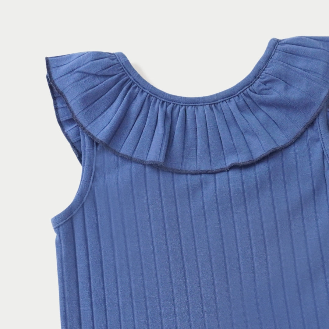 DETAILS : • Bagian belakang bentuk backless • Ada tali silang di bagian garis leher belakangnya • Ada frills di garis leher depan sampai belakang